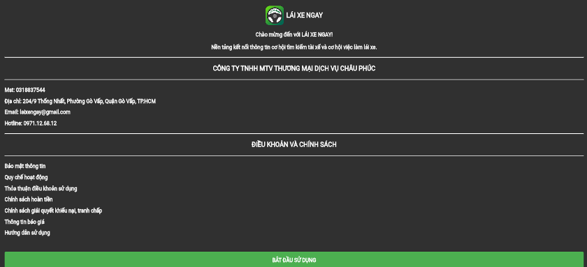 Sàn giao dịch thương mại điện tử LÁI XE NGAY (https://app.laixengay.com) là nền tảng hỗ trợ kết nối nhu cầu trong lĩnh vực vận tải giữa các đơn vị cần điều phối phương tiện và đội ngũ tài xế đang sẵn sàng tham gia hoạt động. Sàn cam kết chỉ hoạt động dưới hình thức Sàn giao dịch TMĐT, cung cấp nền tảng kết nối, và không bao gồm hoạt động đại diện, môi giới việc làm.